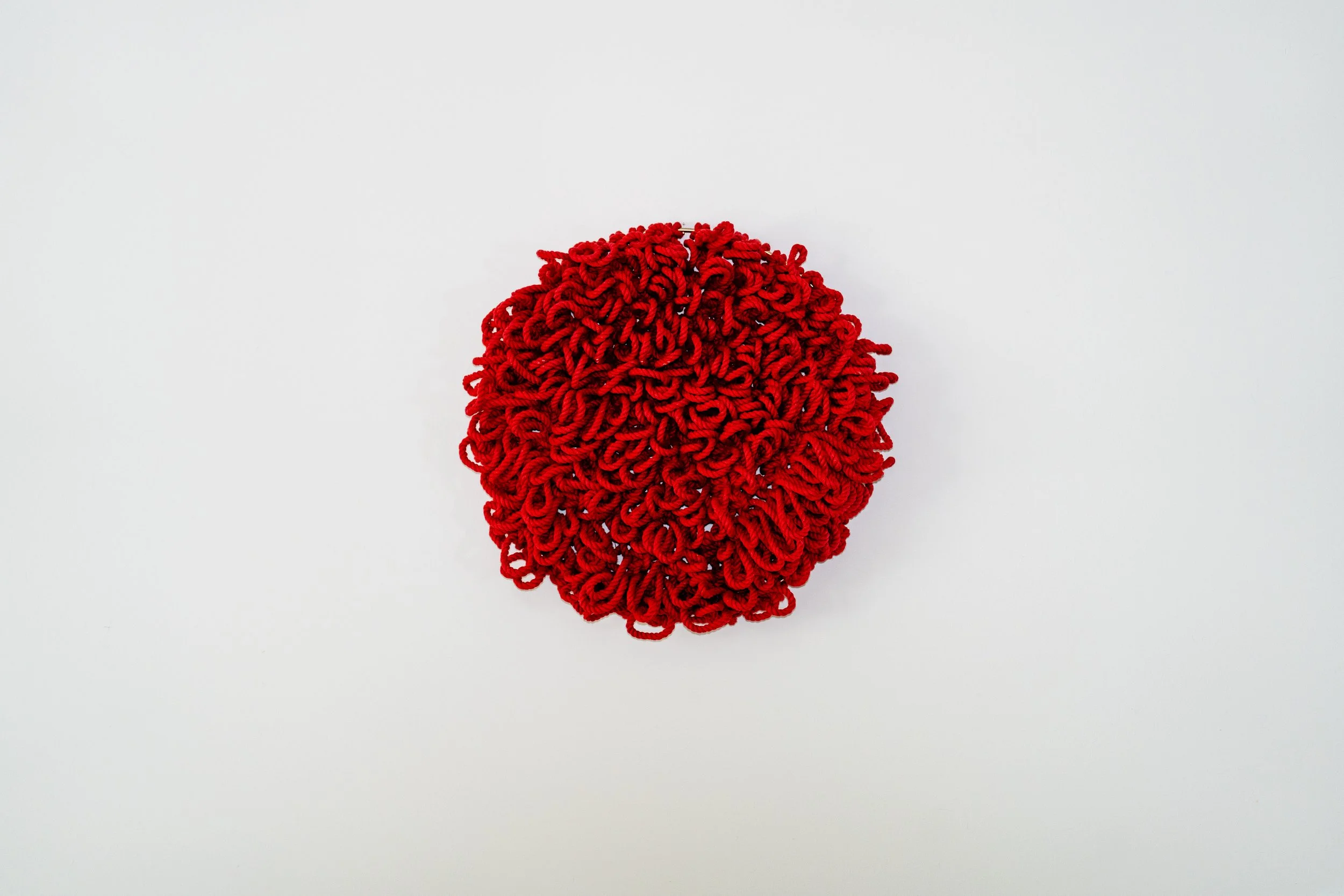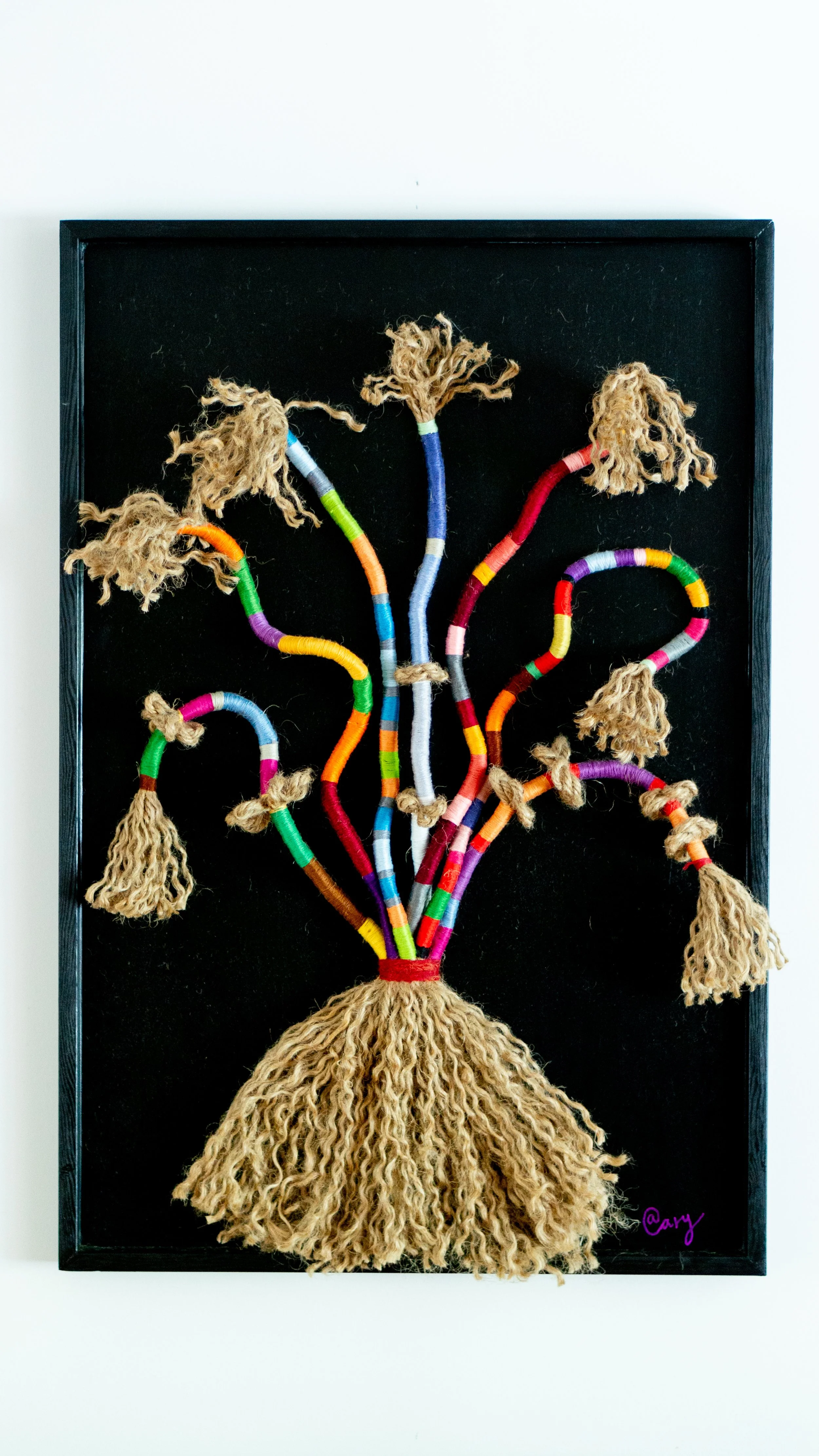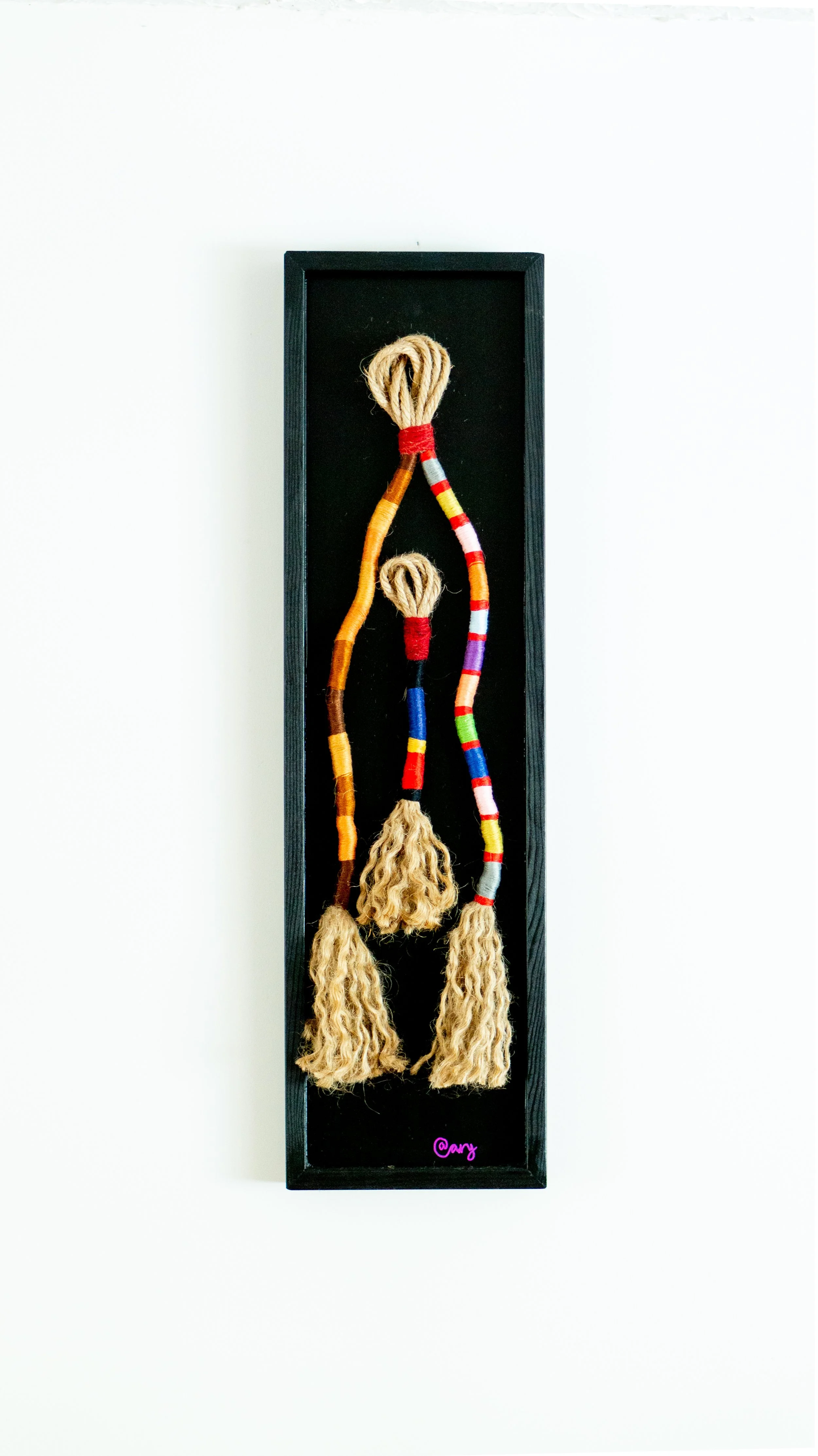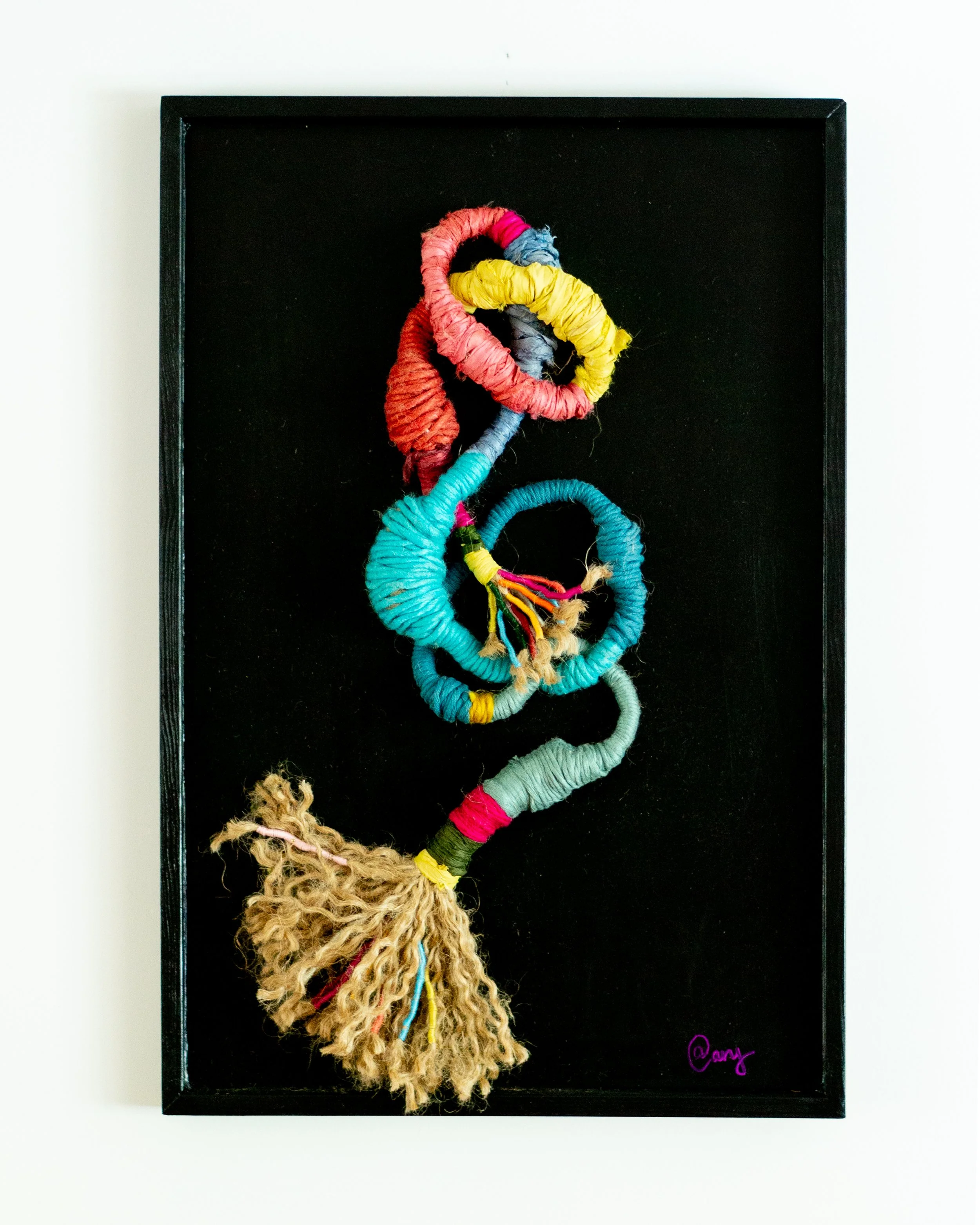 As these pieces emerged it became obvious that I was dealing with uniquely vibrant individuals who fit together so perfectly because of their differences as much as their similarities. All pieces are made of natural jute, bound in cotton thread and pure Moroccan wool attached to custom handmade wooden frames with brass tacks. Inner Workings additionally has pure organic wool, recycled silk and pure merino wool binding the jute. And Then There Were Three additionally encorporates brass rings and a meranti wood scrap.