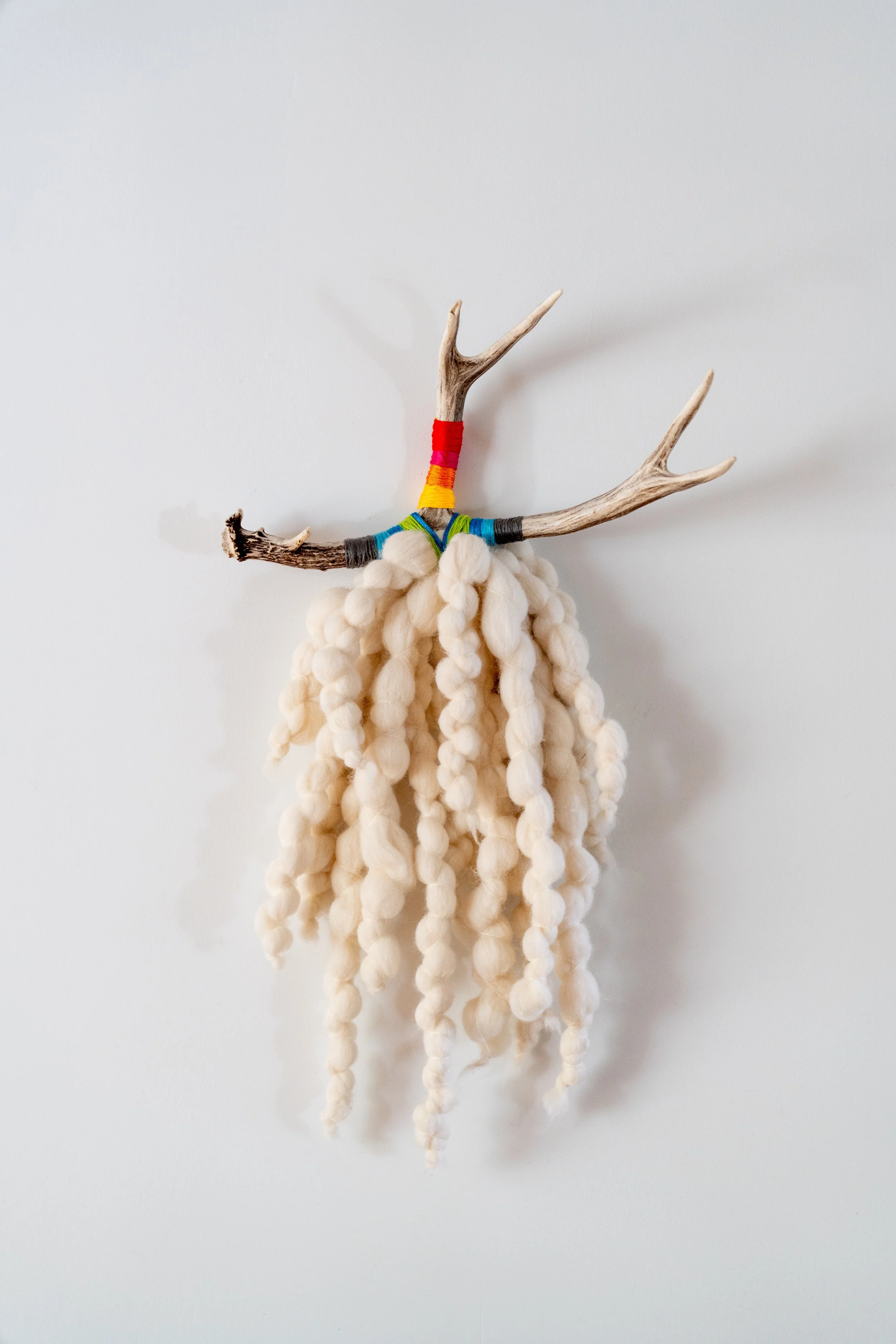 Pure wool roving bound in mohair, tethered to a naturally shed antler with cotton thread. 16” x 24”