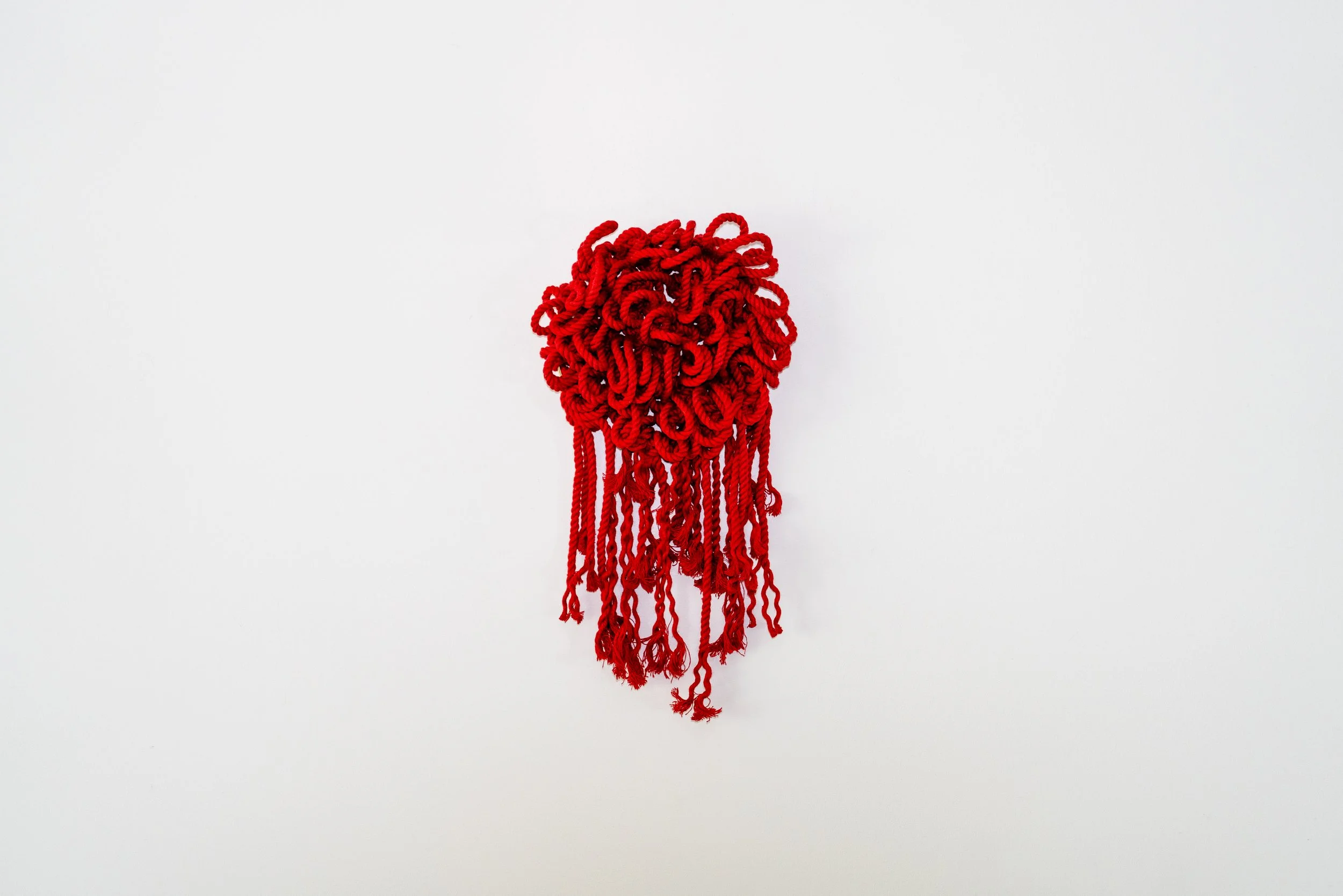 Over 300ft of recycled cotton rope looped and knotted, mounted on painted brass rod and black walnut. 29”w x 64”h