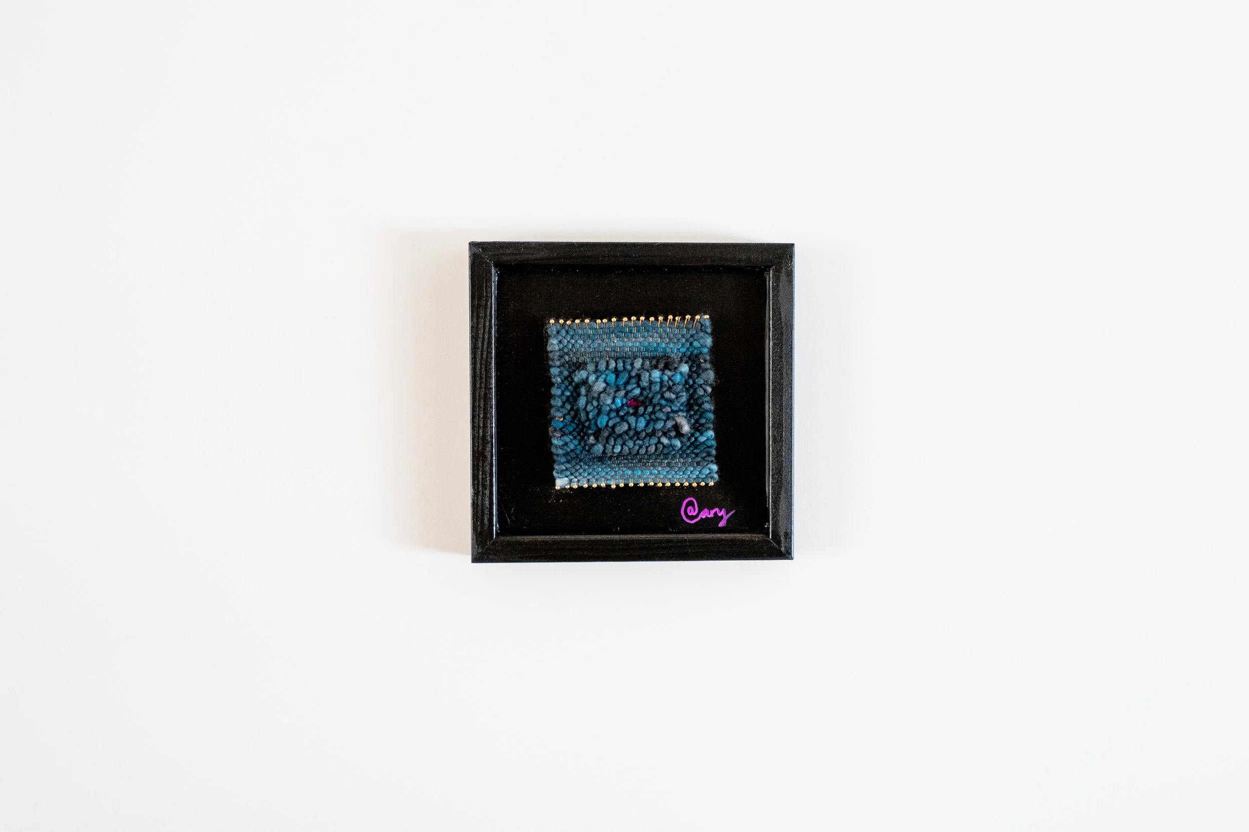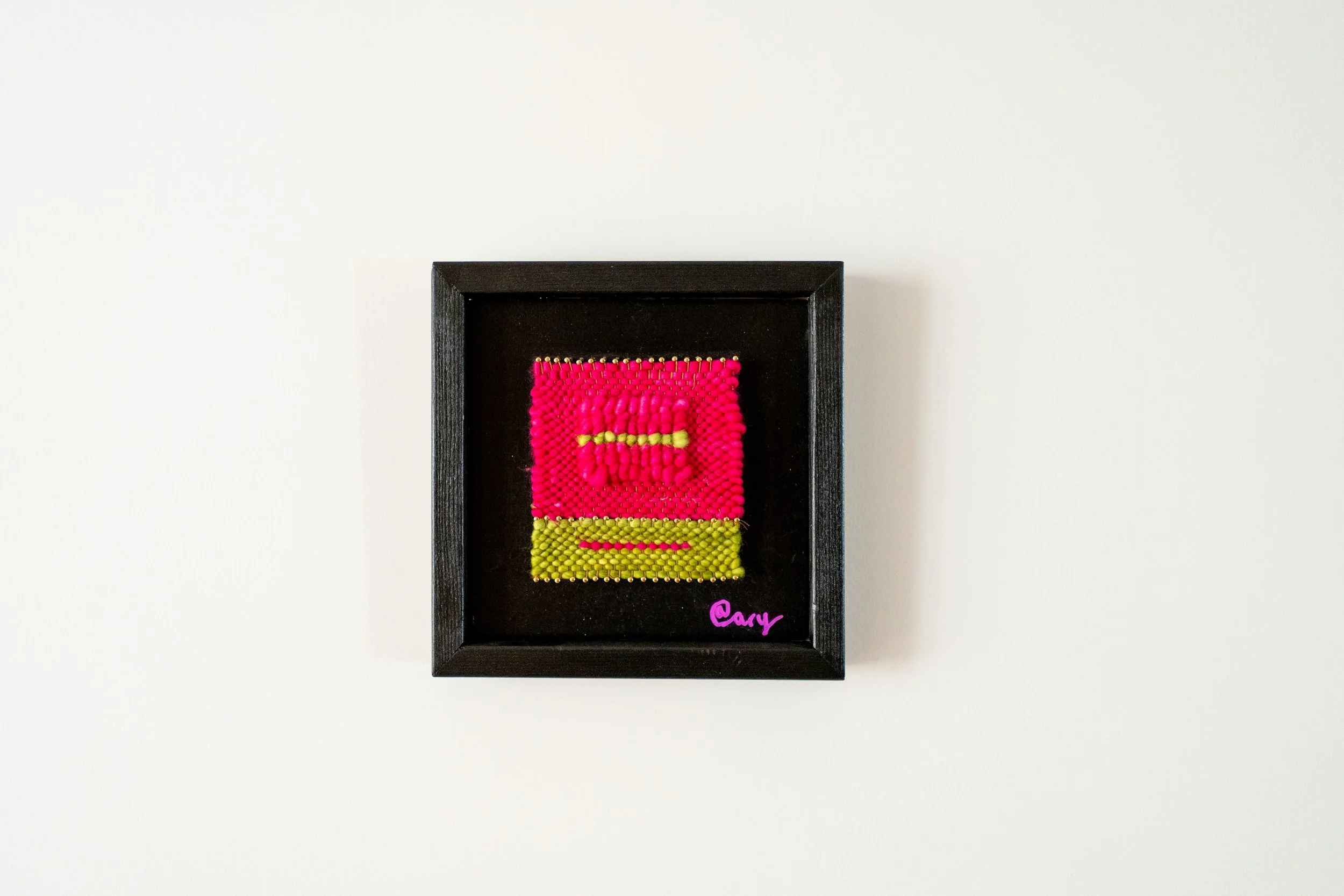 Sweet little weavings of pure merino wool attached to a loom made of brass tacks directly onto a 9” x 9” handmade wooden frame.