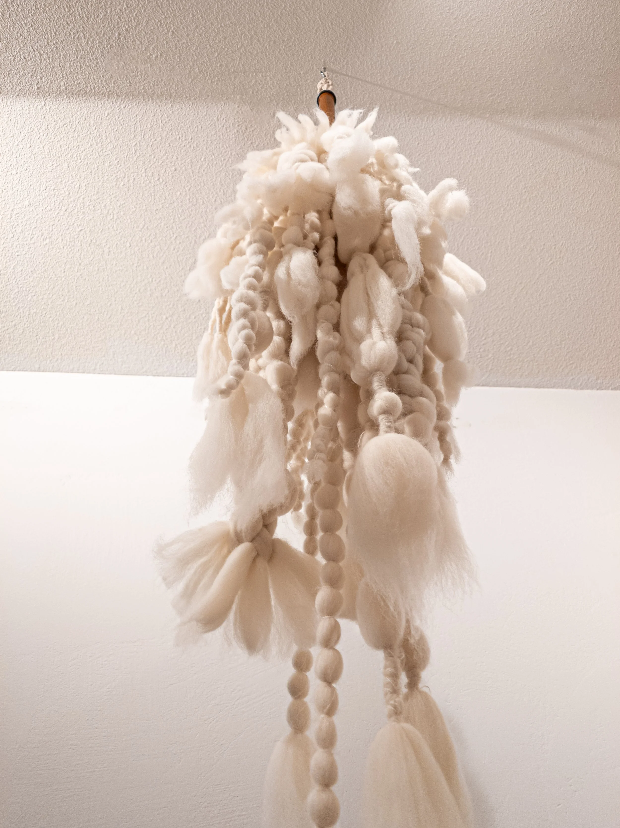 Pure wool roving, knotted, braided, bound in mohair and otherwise manipulated, suspended from a vintage textile bobbin and cotton rope. 9” x 55”